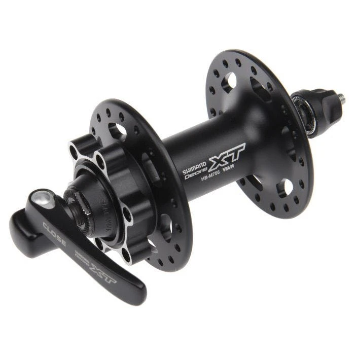The SHIMANO DEORE XT M756 front hub uses cup and cone bearings, 6-bolt rotor mounting, and is secured via a quick release.